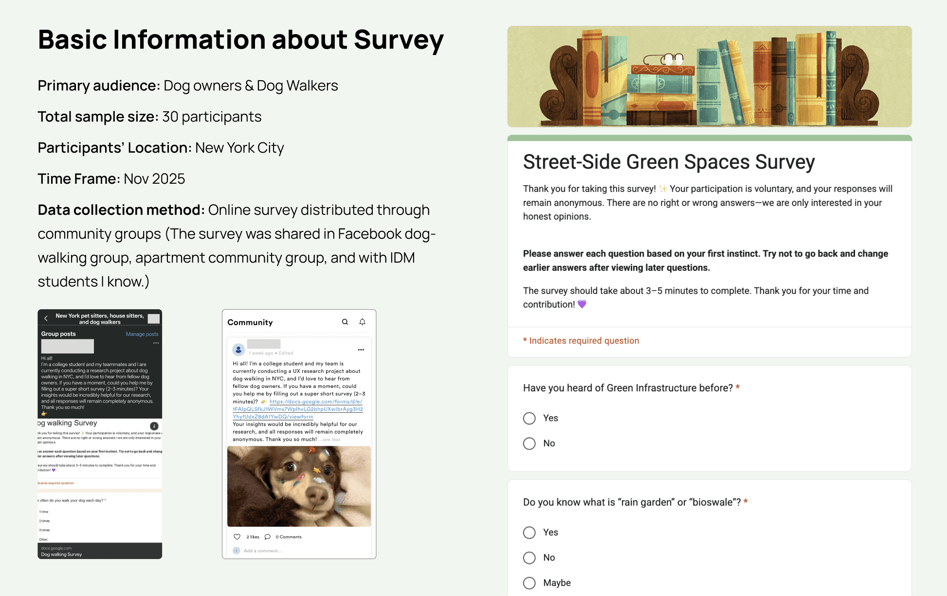 Green Infrastructure (GI) plays a vital role in NYC’s stormwater management system, yet many dog walkers struggle to identify these zones in daily routes. This often leads to accidental intrusion and pet waste that compromise GI’s ecological function. Through field research, surveys, and rapid prototyping, this project explores how environmental UX and micro-interactions can help dog walkers intuitively recognize and avoid GI areas. The outcome is a sensor-triggered awareness concept that highlights the boundary of GI spaces, demonstrating how subtle, human-centered cues can support urban sustainability and encourage more mindful public behaviors.