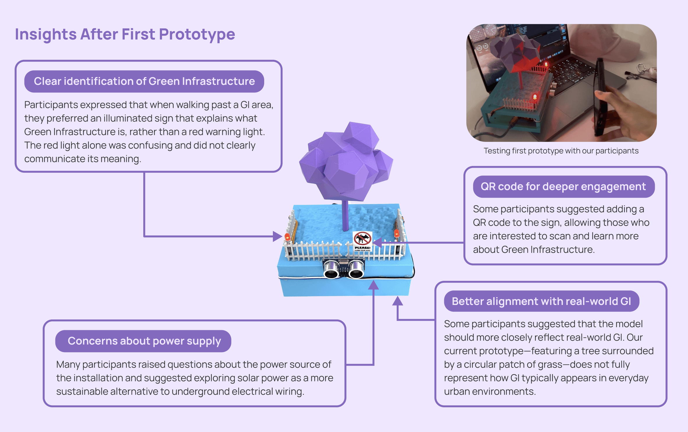 Two initial concepts were explored: a miniature mockup and a physical sign. Through team discussions and early evaluation, the miniature mockup emerged as the more intuitive approach, as it allowed users to immediately understand spatial relationships and interaction cues within Green Infrastructure environments.