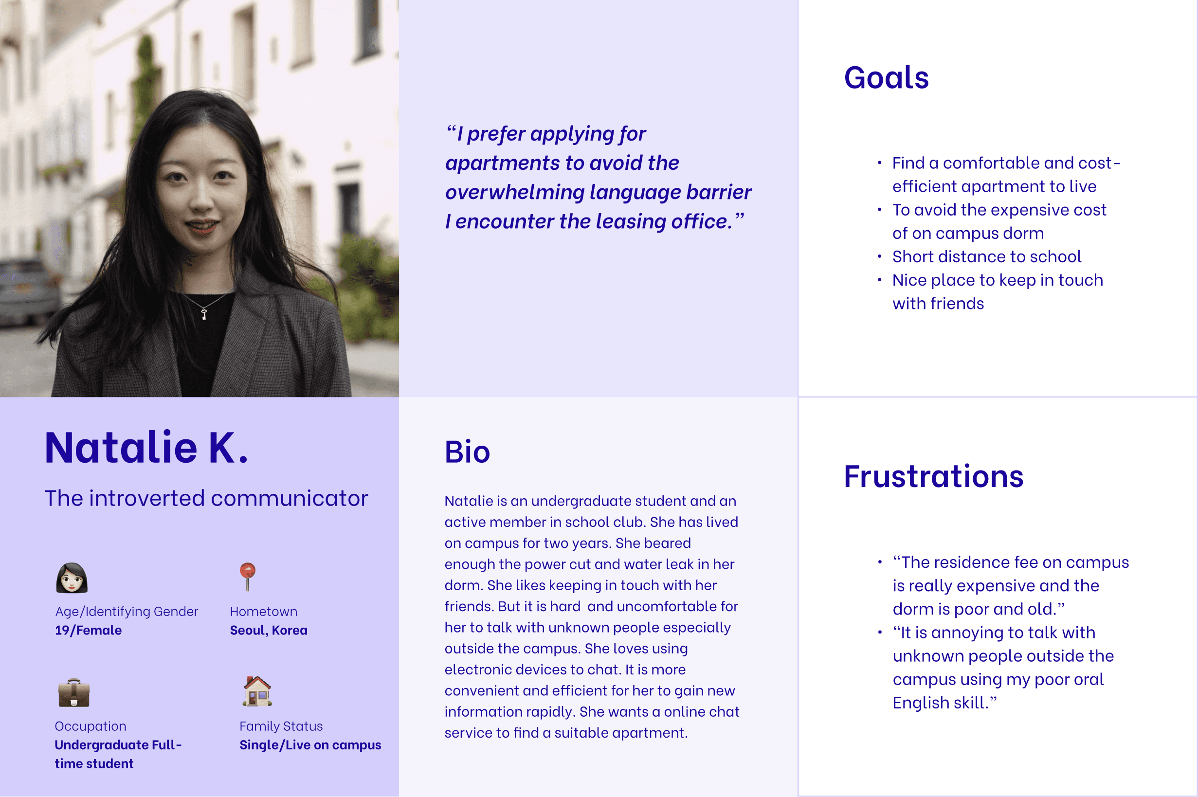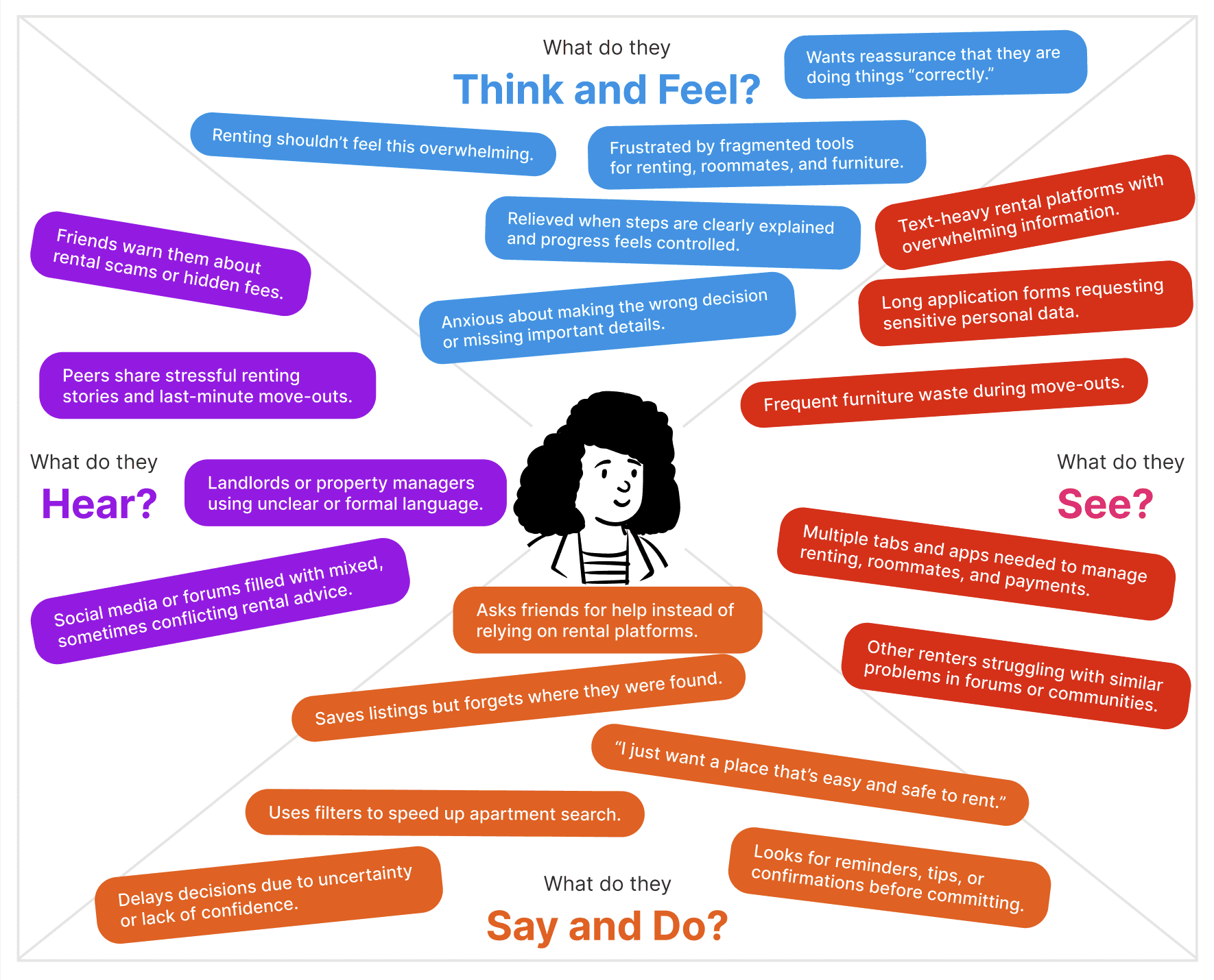 I conducted user interviews and created empathy maps to better understand the people I was designing for and their needs. A primary user group that emerged was international students, many of whom feel uncomfortable communicating with landlords in person and find email-based communication inefficient.
