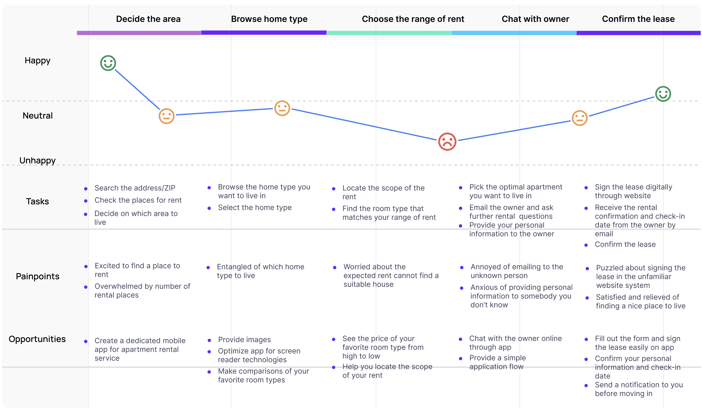 Based on Natalie’s persona, I created a user journey map to understand her end-to-end rental experience. Her goal is to find a suitable apartment through a process that is both efficient and low-stress. Mapping Natalie’s journey highlighted the need for a dedicated Nestly app that centralizes key steps and reduces friction throughout the rental process.
