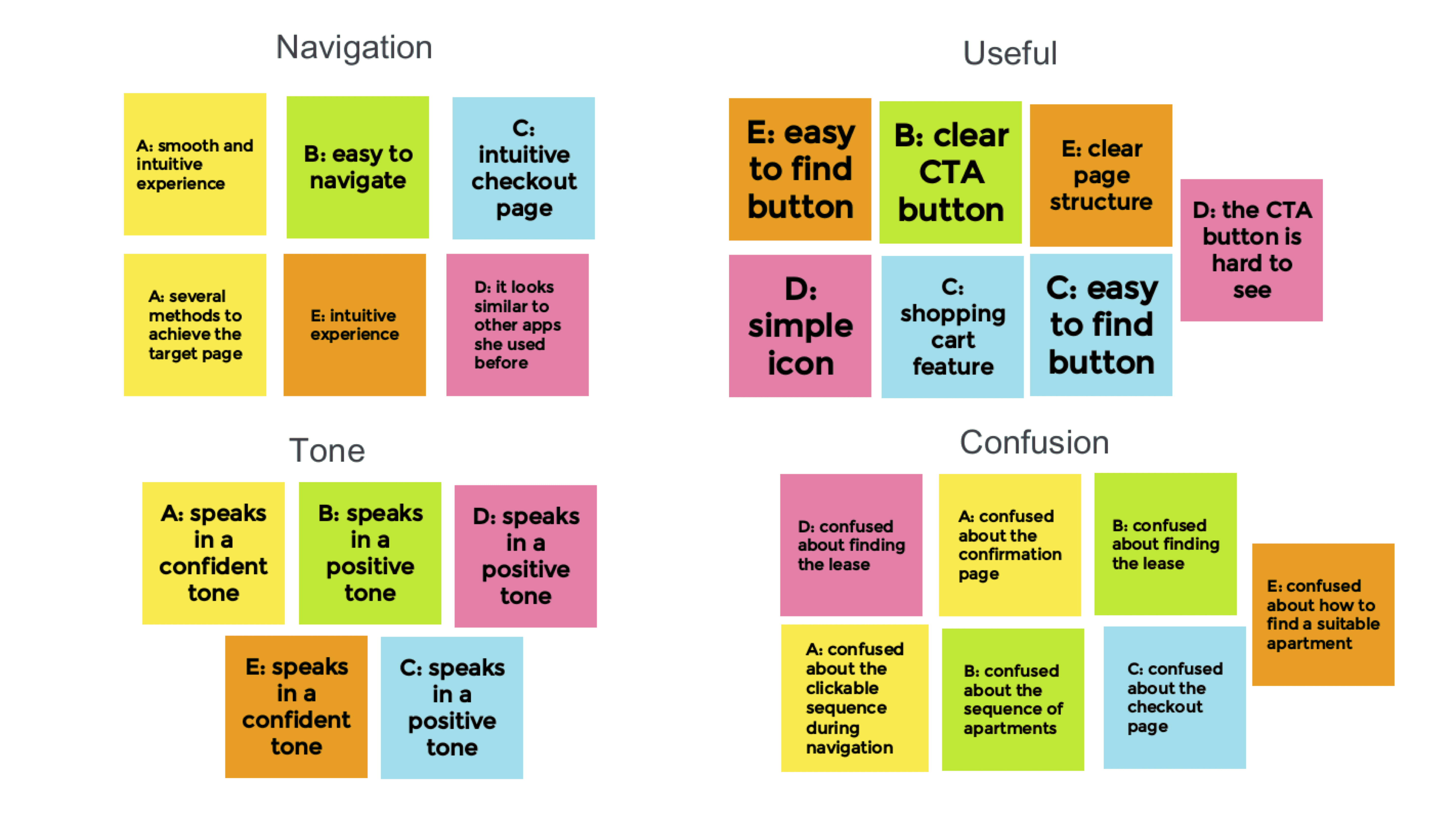 Based on insights from the usability study, I created an affinity map to synthesize findings.